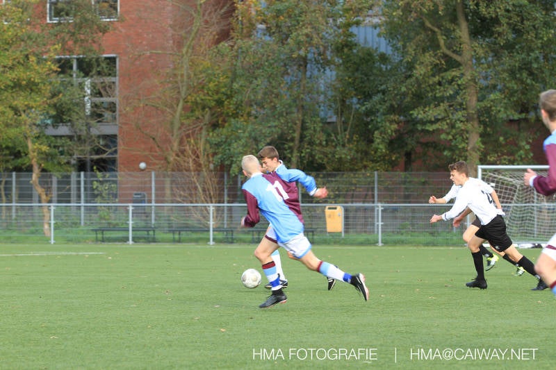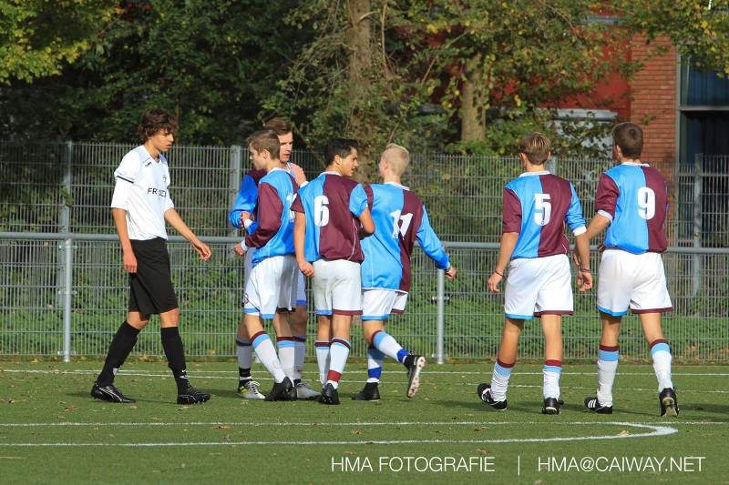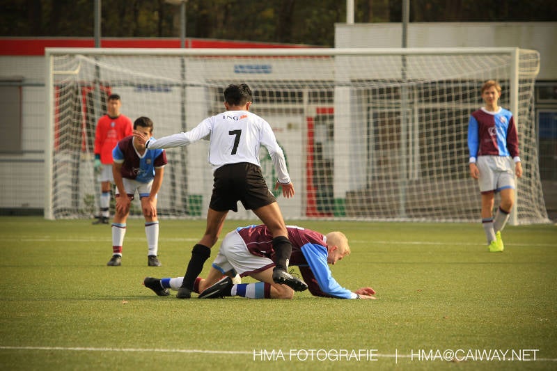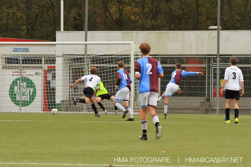 De wedstrijd was begonnen en zowel Die Haghe als Monster lieten de bal het werk doen zodat de wedstrijd leuk was om naar te kijken. Keeper Dokan liet een uitstekende indruk achter en pakte een harde schuiver klemvast.Stuart pakte zijn tegenstander een paar keer fair maar hard aan en liet blijken dat er met de sc Monsterverdediging niet te spotten valt. Een paar mooie steekballen van zowel Roy als Duko zetten Hidde 2x voor de keeper maar die kwam goed uit en verhinderde dat er gescoord werd. Roy had een mooie actie door de bal over zijn tegenstander te wippen en direkt uit te halen richting de kruising, maar de keeper pakte bekwaam.Na een steekbal op Hidde van Duko word het 0-1 en dat is zeker terecht gezien de kansenverhouding.Die Haghe heeft ook nog enkele kansen maar Boris,Guus,Stuart, Riley en Dokan waren niet van om een tegentreffer te incasseren.Thijs schiet via een 1 tweetje met Roy nog op de paal.Hidde heeft de allergrootste kans aan het eind van de eerste helft, maar voor een leeg doel schuift hij de bal buitenkant paal.De rust breekt aan en de vraag was vooral lukt het Monster om met de schamele voorsprong de overwinning binnen te slepen.De look a like van Virgil van Dijk, de grote sterke middenvelder van Die Haghe moet in de tweede helft steeds meer achter de vaak ongrijpbare Roy aan en doordat de hardwerkende en goed voetballende Ahmet samen met technicus Rody ook op het middenveld kort op de bal zitten is de wedstrijd in handen van sc Monster. Guus die een puike partij voetbal speelt rukt met grote indrukwekkende passen over het veld en vind Duko om te kaatsen, hij krijgt de bal goed terug en glipt langs de verdediging waarna hij het leder in de rechteronderhoek schiet. 0-2 Na deze zeer fraaie “bevrijdende “goal is de wedstrijd echter nog niet gespeeld. Het is een minuut later en de voor de rest goed leidende scheidsrechter Ruijl ontgaat een handsbal van de scorende Die Haghe spits. 1-2 Na deze goal word er gewisseld Andreas komt in het veld voor Rody. Na een kopbalpass van Roy scoort Hidde de 1-3 en lijkt de overwinning nabij.Jim komt dan in het veld voor Riley op linksachter en Hidde maakt aan alle illusies van Die Haghe een einde door op aangeven van Roy de 1-4 te maken. Hij maakt ook nog zijn 4e doelpunt door een verkeerde pass van de keeper af te straffen. En zo heeft Monster dus toch hun ware kwaliteit een keer laten zien door deze imponerende uitzege van 1-5 op Die Haghe. Volgende week een thuidwedstrijd tegen Honselersdijk om 12.30.