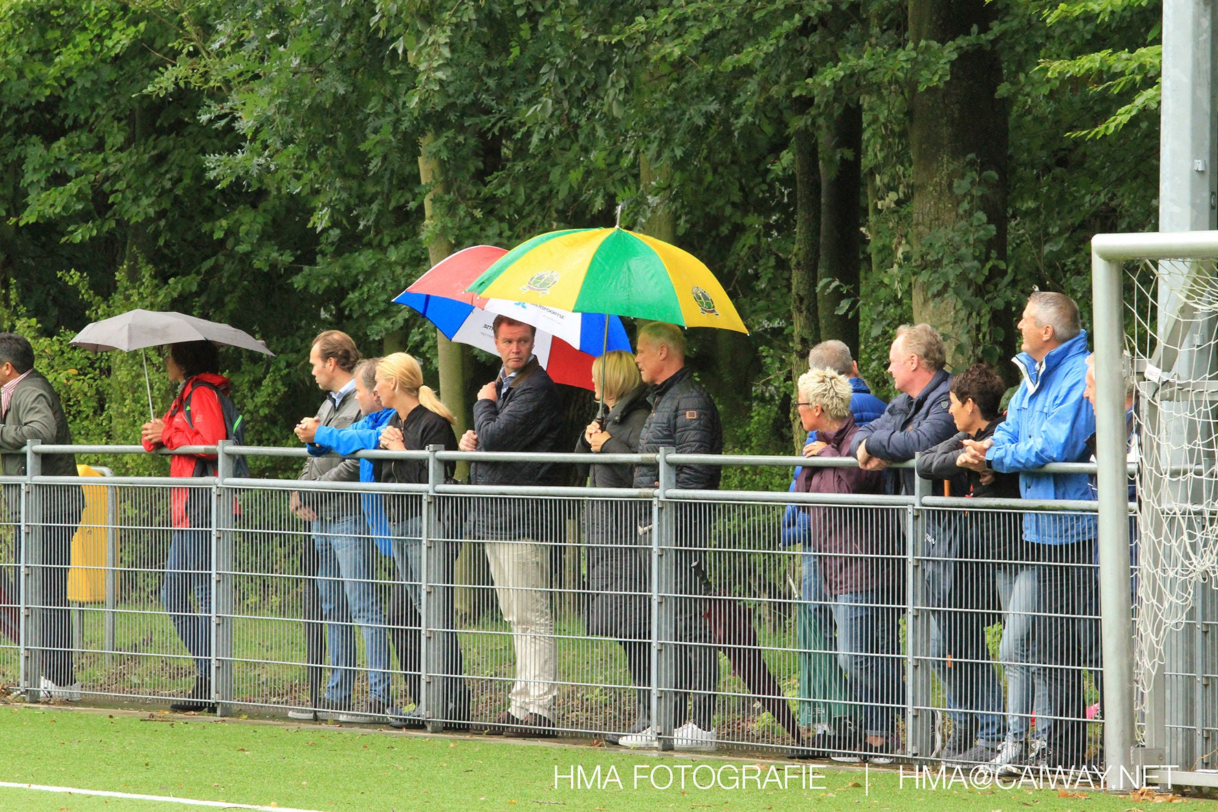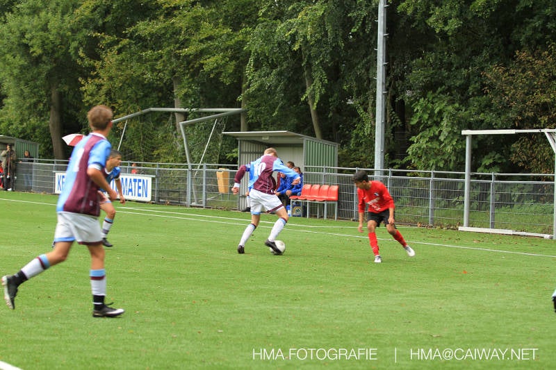 Vele ouders met paraplu's hadden zich verzameld langs de lijn. Dat inspireerde de spelers van Monster om werkelijk alles te geven in deze op voorhand ongelijke strijd. Toch was in de eerste helft de kansenverhouding tussen beide ploegen gelijk. Alleen waar Monster uit 4 kansen 1 keer wist te scoren deed GDA dit beter door 4 uit 4 te behalen. Maar het doelpunt van Monster was zeer fraai. Thijs Looije een plaag voor de GDA verdediging was door inzet en snelheid twee man de baas en na zich vrijgespeeld te hebben met zijn linkerbeen stifte hij de bal met rechts over de verbaasde keeper in de rechterbovenhoek. Het applaus voor dit kunststukje galmde over het GDA terrein.