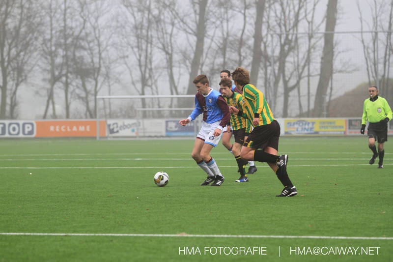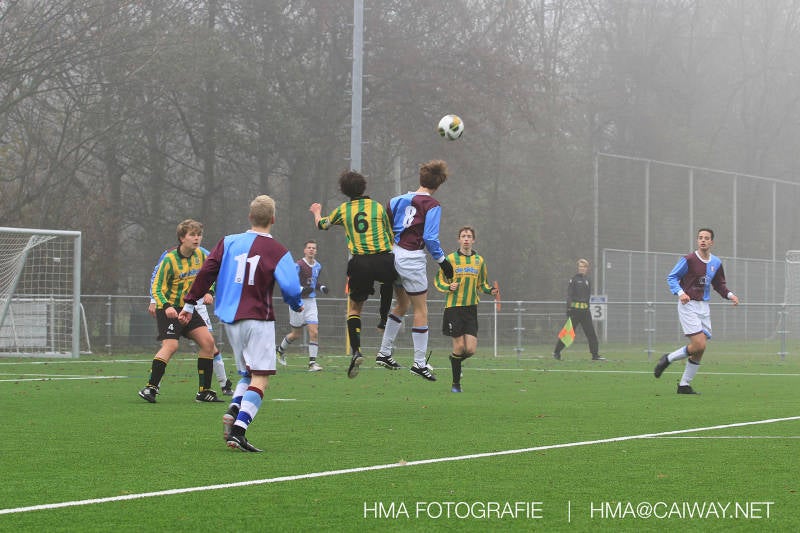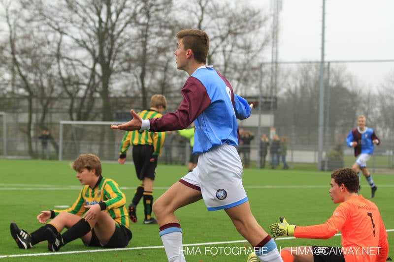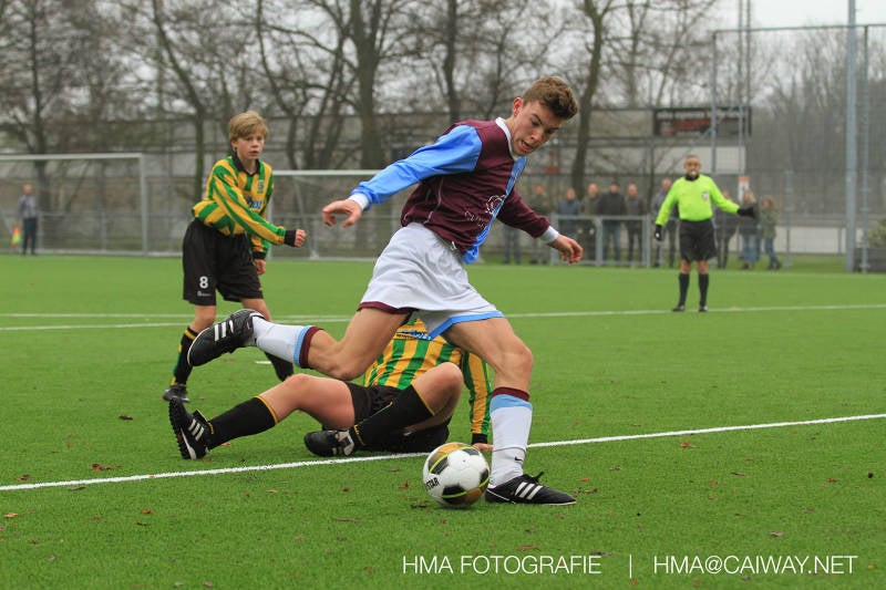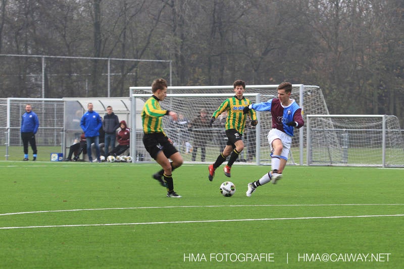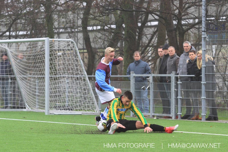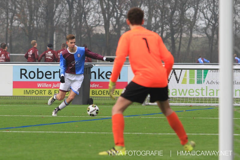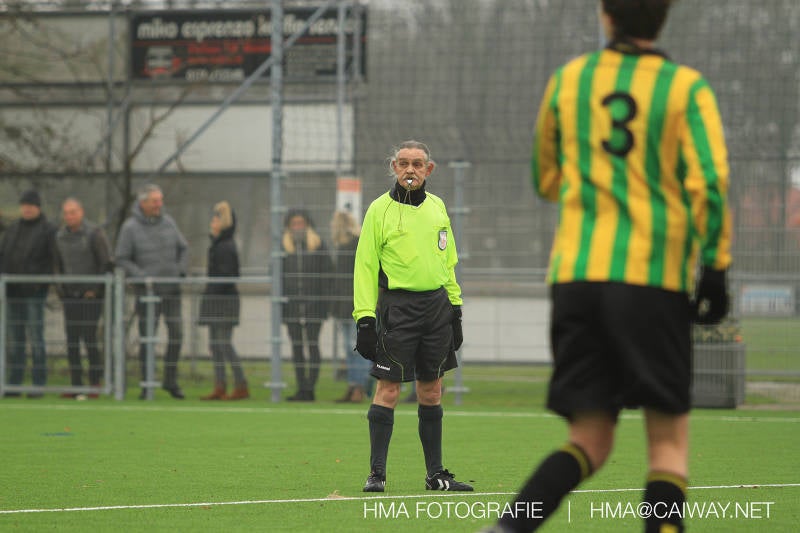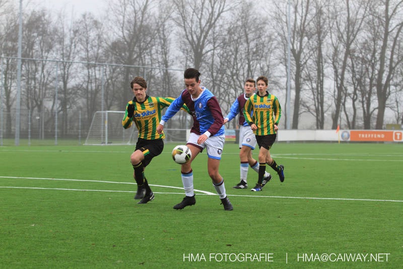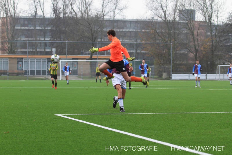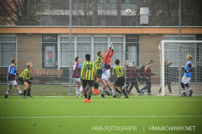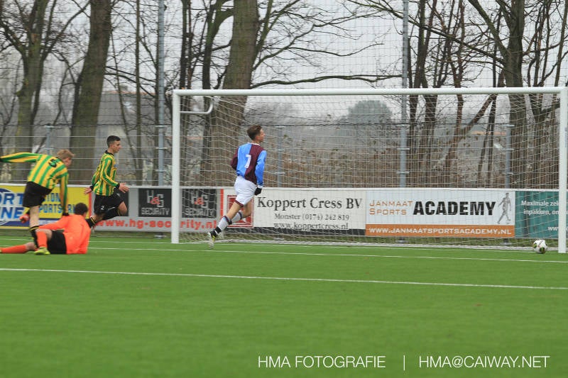 Het was duidelijk te zien in de beginfase van de thuiswedstrijd tegen Graaf Willem dat de spelers hard werkten om de tegenstander onder druk te houden. Dit leverde dan ook een aantal kansen op. Met kunst en vliegwerk wist de keeper van Graaf Willem met steun van zijn verdediging de bal uit het doel te houden. Er werd geschoten,gekopt een volley een omhaal echter geen enkele poging ging over de doellijn. Het middenveld bestaande uit Andreas,Ahmet en David werkte hard om de aanval te steunen in het veroveren van de bal. Heel soms kwam Graaf Willem er snel en gevaarlijk uit, vooral de linksbuiten liep een paar keer richting de achterlijn om voor te zetten. Eenmaal gebeurde dat zo goed dat de bal langs de verdediging van Monster op de rand van de zestien ingeschoten kon worden. De poging kwam op keeper Dokan zijn grote teen en verdween net over de lat. Dat was even schrikken. In de laatste minuut van de eerste helft kreeg Monster eindelijk hun verdiende beloning. Scheidsrechter Postma gaf een hoekschop cadeau en het was Thijs die de bal richting tweede paal voorgaf. Hidde probeerde in te koppen, maar de bal smoorde tegen een verdediger. Duko dacht het vrijgekomen projectiel in te schieten echter de keeper redde. De rebound stiftte Duko in het dak van de goal. Na deze 1-0 was het rust. Na rust begon Monster weer met druk zetten en kreeg een paar goede mogelijkheden. De onzekerheid door het uitblijven van het tweede doelpunt werd groter, en het was vooral in die fase dat Stuart en Guus goed rugdekking gaven aan de backs Boris en Riley. Trainer Arjan bracht Jim in voor de leeggestreden Ahmet en ging 5-3-2 spelen door Thijs naar de kant te halen voor de herstelde Boy. Het blok wat nu achterin stond kon zodoende de opkomende middenvelders en laatste man van Graaf Willem opvangen. Dit lukte uitstekend op 1 moment na. De snelle rechtsbuiten was Riley ontglipt en ging richting de goal van Dokan.Hij schoot en de bal ging gelukkig voor de paal langs over de achterlijn. Het laatste fluitsingaal had geklonken en een welverdiende ovewinning werd gevierd waarvoor sc Monster keihard had geknokt! De laatste competitiedag volgende week kan er van alles gebeuren. Verburch is de opponent, terwijl de concurrenten ook moeilijke wedstrijden spelen.