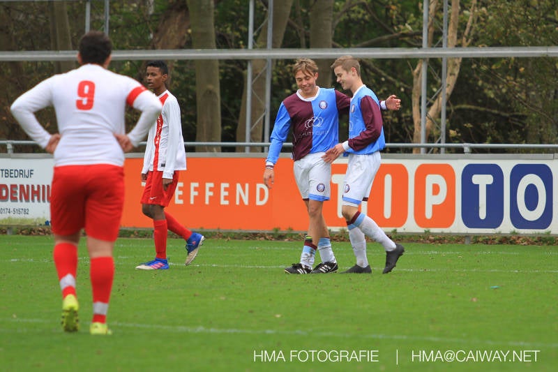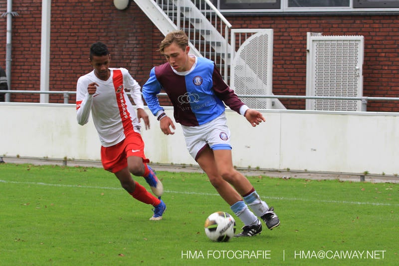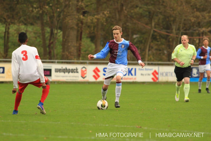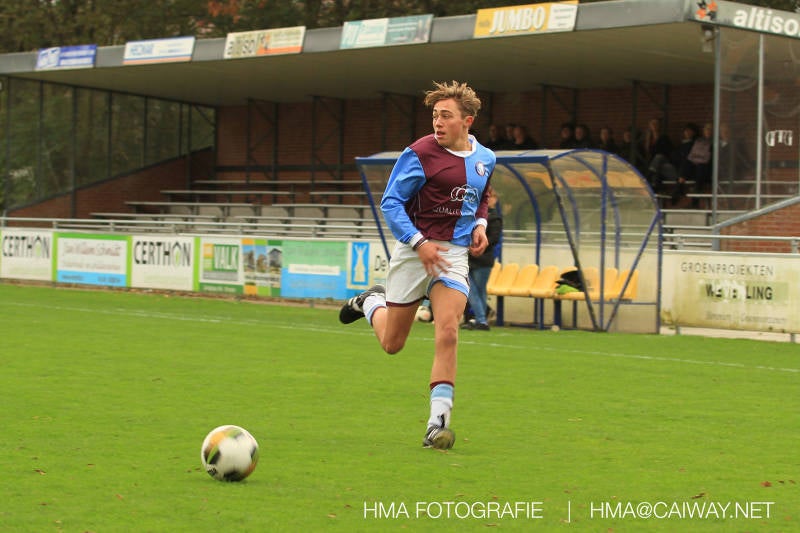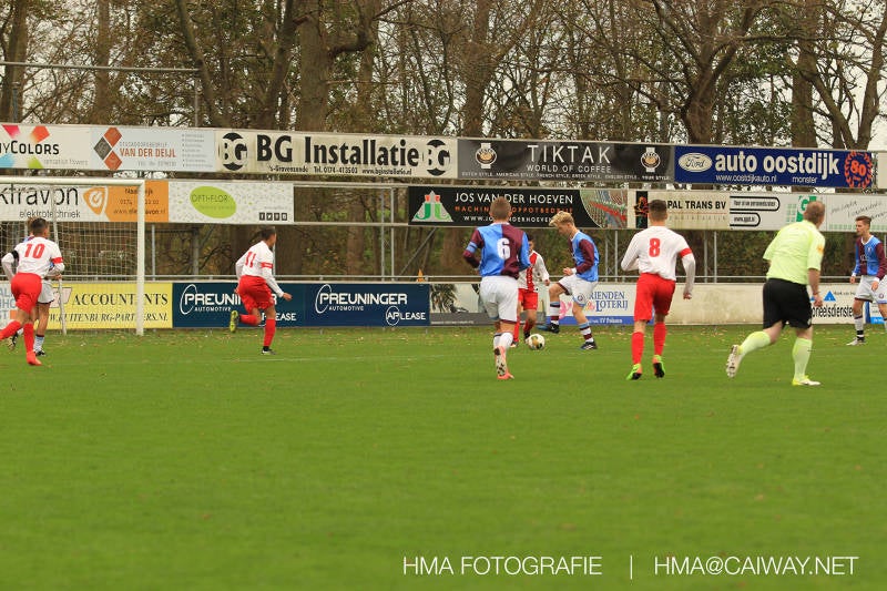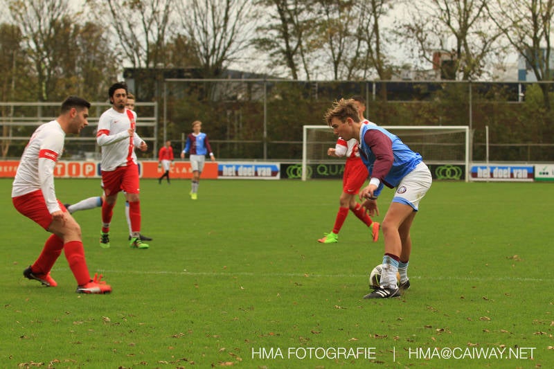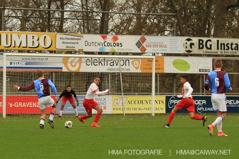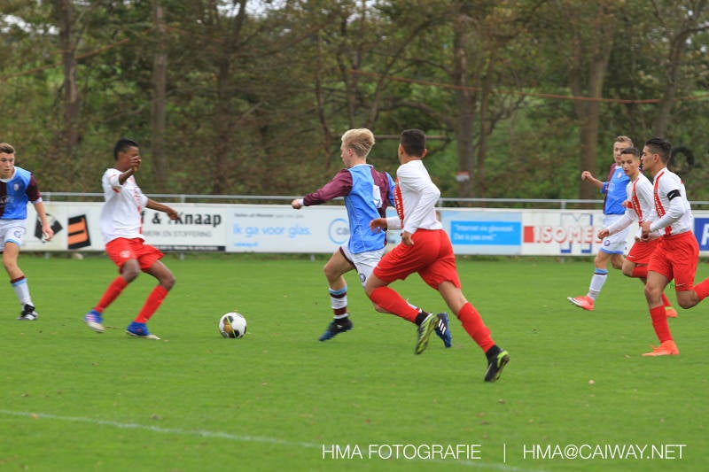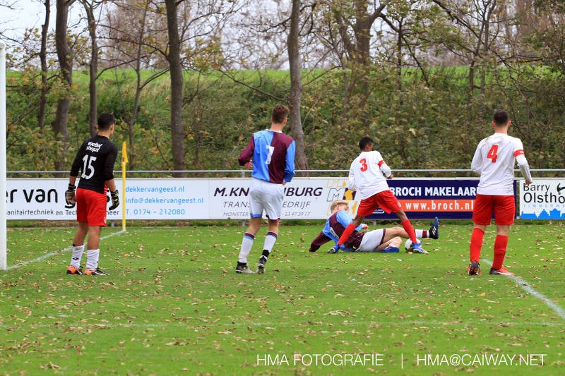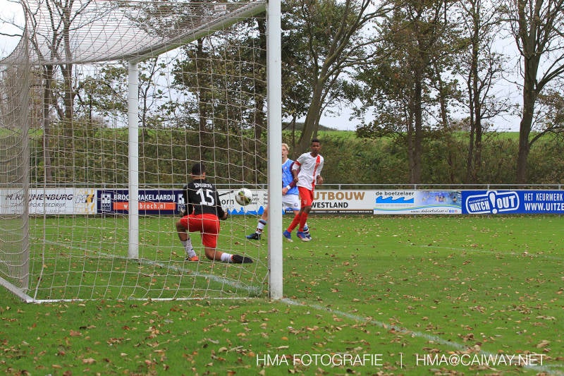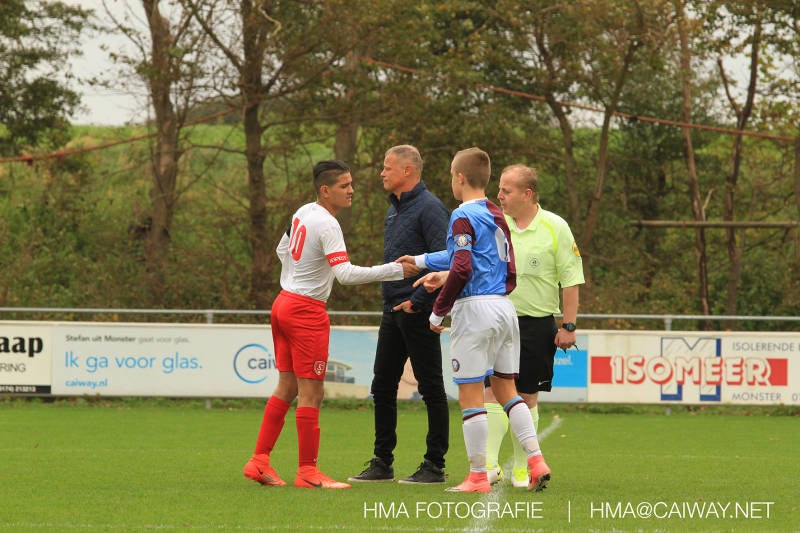 Na enig gemopper van hem alsook vanaf de tribune begrepen de spelers wat er van hen verwacht werd en de driehoekjes en 1 tweetjes werden uitgevoerd zodat keer op keer de vrije man voor de goal kwam. Ik zal u elk doelpunt niet van een beschrijving voorzien , maar er waren een paar wonderschone bij. Grote animator met snelle balbehandeling Roy v/d Ven strooide mat passes en doordat de buitenspelers het veld “breed” hielden konden Duko Blans 4x,Guus Faber 3x,Riley Eikelenborg 2x, Ahmet Ayyildiz 2x, Rody Kruithof 1x , Hidde v/d Arend 1x en Roy 2x scoren. Keeper Dokan Jeekel had een soort van vrije dag en stond vaak als laatste man meters voor zijn srafschopgebied. Dat had de beste speler aan Hercules zijde, de nummer 10 met de aanvoerdersband, goed gezien en hij lobte de bal dan ook een keer vanaf 35 meter over Dokan heen het goal in. Stuart Schouw hield de achterhoede op goede afstand van de middenvelders zodat de ruimtes niet te klein werden om te voetballen. En met assistentie van Boris van Dijk ,Boy Hoevenaar en Riley werd vooral de “nummer 10” van Hercules de rest van de wedstrijd aan banden gelegd. Jim Meijer pakte ook weer veel speelminuten mee en krijgt meer en meer wedstrijdritme.Rest mij nog te vertellen dat door deze 15-1 overwinning sc Monster opgerukt is naar de 5e plaats en zodoende de promotiepoule in zicht is. Het is namelijk zo dat er na de winterstop opnieuw word ingedeeld en de bovenste 4 van deze najaarscompetitie ingedeeld worden in een promotiepoule voor de Hoofdklasse. Maar dat is nog een lange weg te beginnen volgende week zaterdag uit bij het Koningklijke HVV in Den Haag om 12.35.