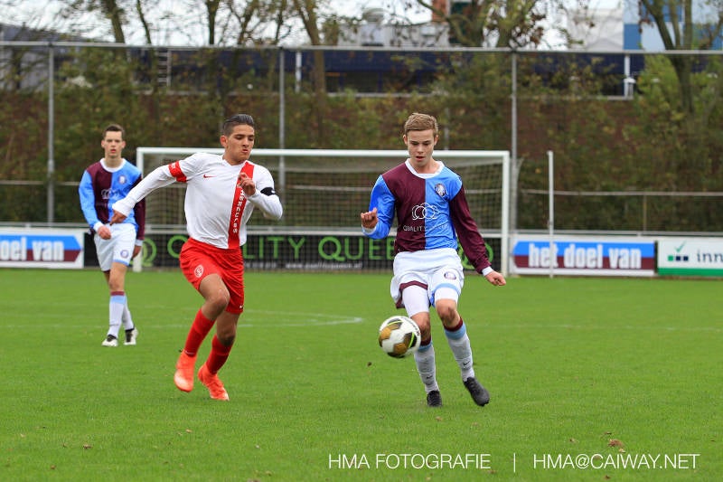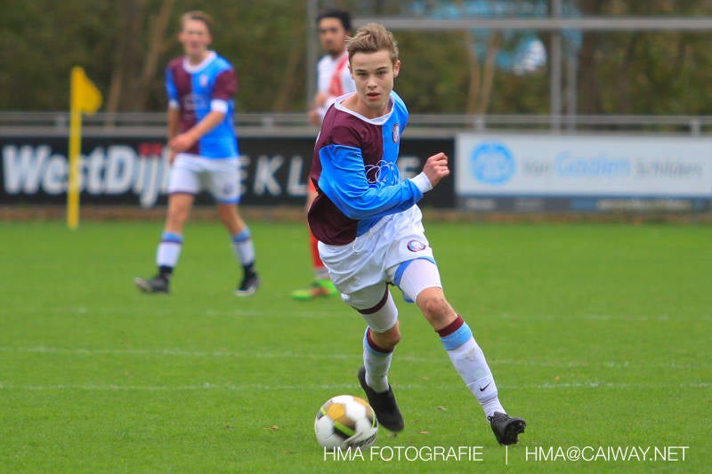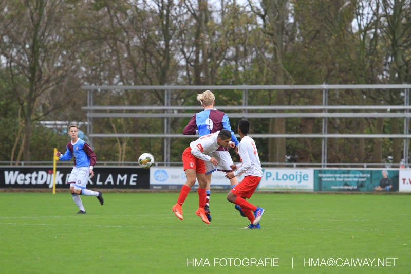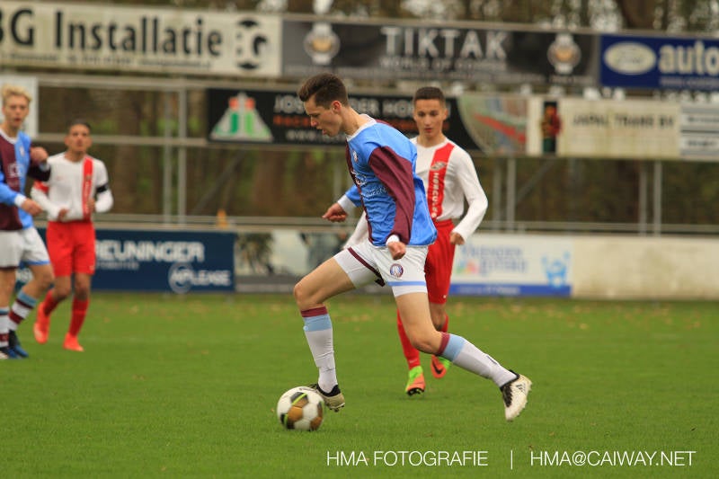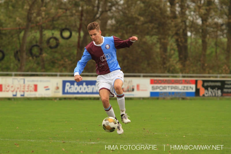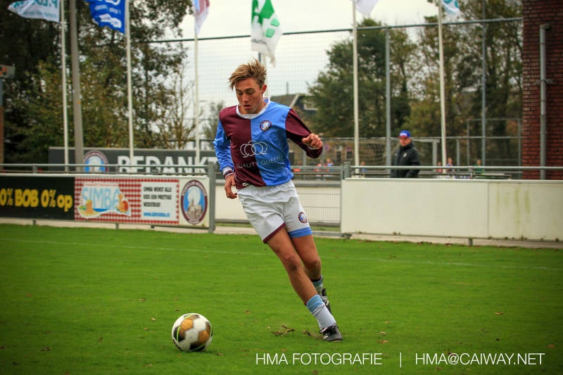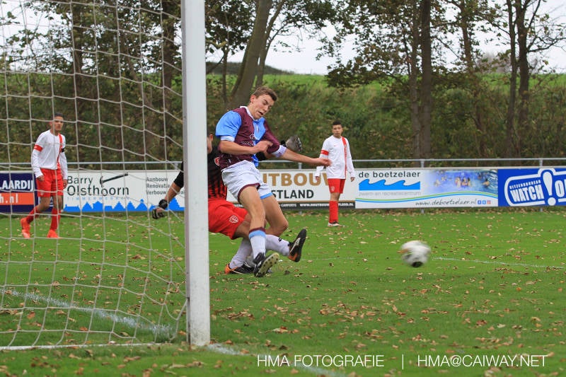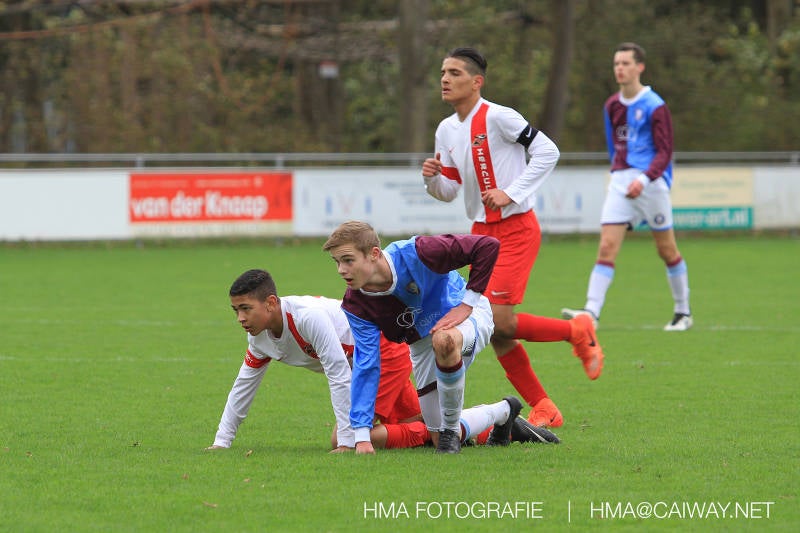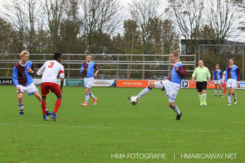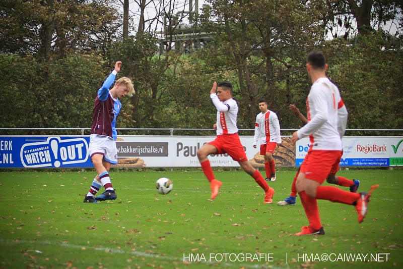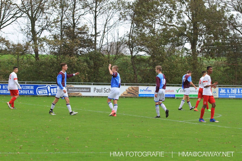 Na enig gemopper van hem alsook vanaf de tribune begrepen de spelers wat er van hen verwacht werd en de driehoekjes en 1 tweetjes werden uitgevoerd zodat keer op keer de vrije man voor de goal kwam. Ik zal u elk doelpunt niet van een beschrijving voorzien , maar er waren een paar wonderschone bij. Grote animator met snelle balbehandeling Roy v/d Ven strooide mat passes en doordat de buitenspelers het veld “breed” hielden konden Duko Blans 4x,Guus Faber 3x,Riley Eikelenborg 2x, Ahmet Ayyildiz 2x, Rody Kruithof 1x , Hidde v/d Arend 1x en Roy 2x scoren. Keeper Dokan Jeekel had een soort van vrije dag en stond vaak als laatste man meters voor zijn srafschopgebied. Dat had de beste speler aan Hercules zijde, de nummer 10 met de aanvoerdersband, goed gezien en hij lobte de bal dan ook een keer vanaf 35 meter over Dokan heen het goal in. Stuart Schouw hield de achterhoede op goede afstand van de middenvelders zodat de ruimtes niet te klein werden om te voetballen. En met assistentie van Boris van Dijk ,Boy Hoevenaar en Riley werd vooral de “nummer 10” van Hercules de rest van de wedstrijd aan banden gelegd. Jim Meijer pakte ook weer veel speelminuten mee en krijgt meer en meer wedstrijdritme.Rest mij nog te vertellen dat door deze 15-1 overwinning sc Monster opgerukt is naar de 5e plaats en zodoende de promotiepoule in zicht is. Het is namelijk zo dat er na de winterstop opnieuw word ingedeeld en de bovenste 4 van deze najaarscompetitie ingedeeld worden in een promotiepoule voor de Hoofdklasse. Maar dat is nog een lange weg te beginnen volgende week zaterdag uit bij het Koningklijke HVV in Den Haag om 12.35.