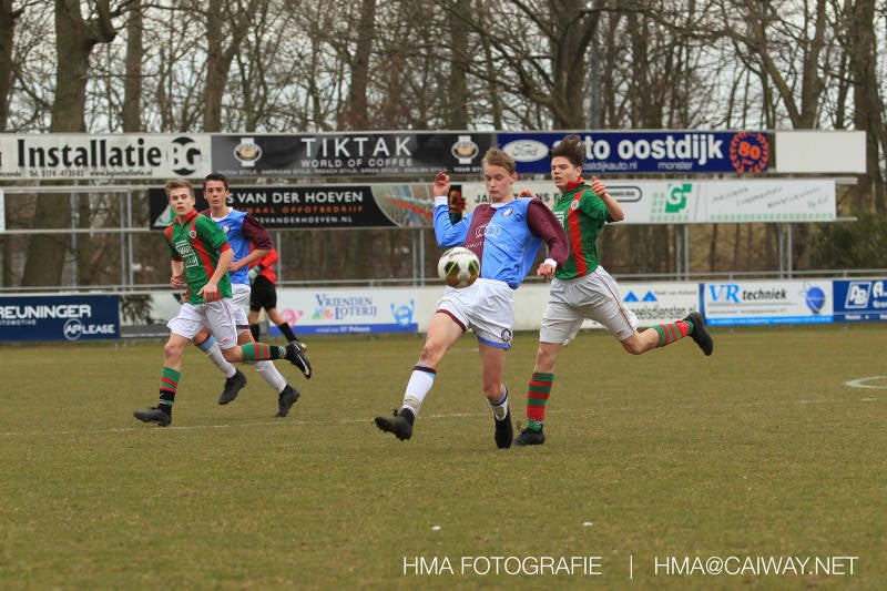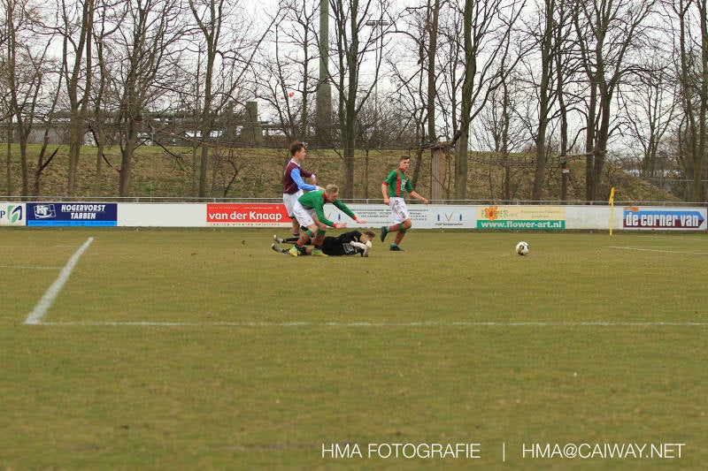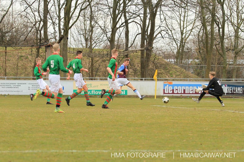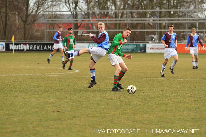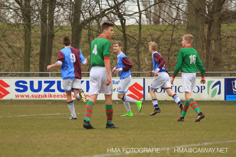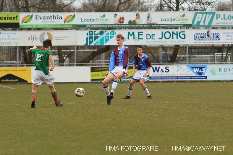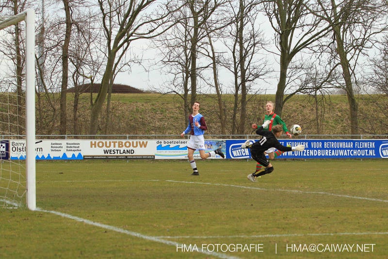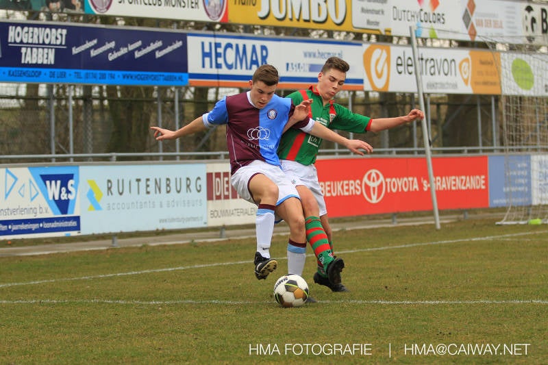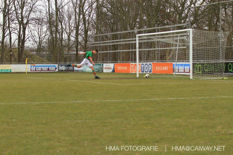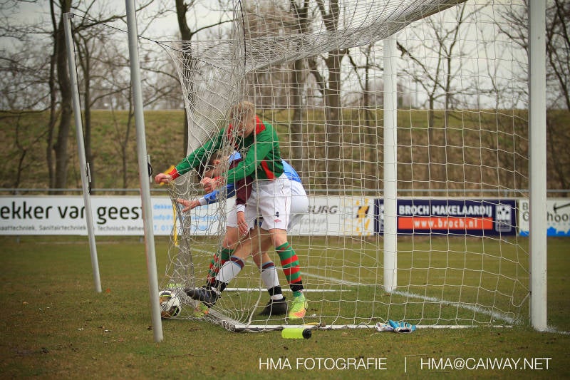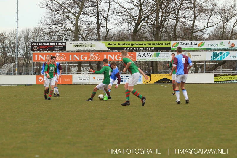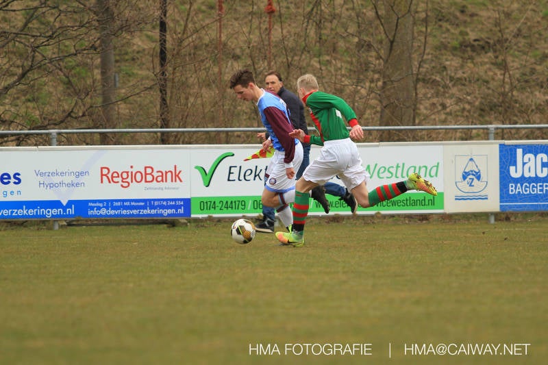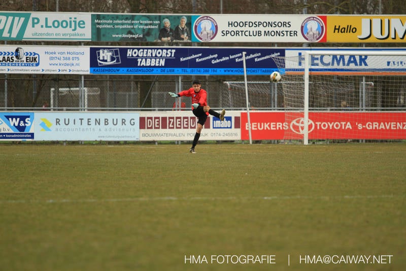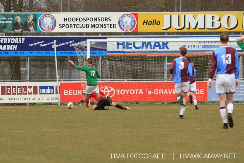 De wedstrijd was begonnen en het was Velo dat met het 4-4-2 systeem razendsnel omschakelde na balverlies van Monster. Telkens weer stonden de middenvelders David Borgdorff,Ahmet Ayyildiz en Andreas Harinxma positioneel verkeerd opgesteld bij balbezit alsook zonder bal teveel naar voren waardoor bij balverlies de Velo spelers alle ruimte kregen voor het scheppen van kansen. De eerste minuut ontsnapte Monster nog maar in minuut 12 en 19 scoorde Velo 2 maal en dat was een logisch gevolg van het slechte positiespel van Monster. Meer coaching van achteruit is dan nodig om spelers op hun positie te wijzen. Dat Hidde v/d Arend in minuut 20 de aansluitingstreffer maakte en bijna ook de 2-2 op de schoen had(de keeper verkeek zich niet op zijn stiftje) was boeiend voor het schouwspel. De supporters zaten op het puntje van de stoel en het Velo publiek juichte bij de 1-3, Boy Hoevenaar speelde Duko Blans in die de bal niet onder controle kreeg en heel Monster stond toe te kijken hoe Velo de vrijgekomen bal razendsnel naar de spits kon spelen die simpel kon binnentikken.Bo Olstoorn spelend als linksachter moest veel ingrijpen bij dreigende situaties en Riley Eijkelenborg de rechtsachter bikkelde voortdurend om zijn ploeg te laten zien wat nodig was om Velo partij te geven. Uit een laag gegeven hoekschop van Thijs Looije kon Boy de bal van een meter of 9 in de rechterhoek schieten zodat de spanning net voor rust weer opliep 2-3. Scheidsrechter Thijs Hoekveen blies voor het begin van de tweede helft en op het middenveld van Monster waren 2 wissels gebracht. David maakte plaats voor Roy en Twan Lagrauw nam de plaats in van Andreas die niet helemaal fit was. Roy kreeg direkt een trap op de enkel , maar ging door en met mooie voetbalacties werd Velo naar achteren gedrongen. Uit een corner kopte Roy via het lichaam van een verdediger de 3-3 binnen. Dit doelpunt en de hoop dat het nu wel goed zou komen werd in 2 minuten de grond ingeboord. Eerst was het Dokan Berendse die een ongelukkige wedstrijd keepte en te weinig tijd voor zijn intrap nam en de bal pardoes voor een middenvelder van Velo trapte. Die bediende de spits en met een lob maakte hij de 3-4. Een minuut later word de in buitenspelstaande linksbuiten aangespeeld, hij neemt de bal echter niet aan en de overnemende linkermiddenvelder krult het leder om Dokan heen in de verre hoek 3-5. Na deze slappe momenten staat Monster op en probeert via alles of niets nog een punt te slepen uit deze wedstrijd. Stuart Schouw blijft alleen achter als laatste man en met de doorgeschoven Boy word meer grip op het middenveld verkregen. Kans op kans volgt waarbij vooral opvalt hoe het team werkt als een eenheid en je kan je afvragen waarom nu pas. De 4-5 word binnengeschoven door Hidde die pijlsnel achter de verdediging was doorgelopen. En werkelijk in de 80e minuut komt de bal voor en is het Duko die het ronde projectiel met een slimme hakbal vanaf bijna de achterlijn tegen de keeper aanschiet en de bal tergend langzaam over de doellijn loopt 5-5!!Wat een spektakel en ook een vreugde. Een meeslepend duel,slecht gespeeld toch nog een punt. Volgende week uit bij Die Haghe en dat het beter moet zal trainer Arjan in de trainingen van komende week wel overbrengen.