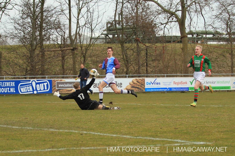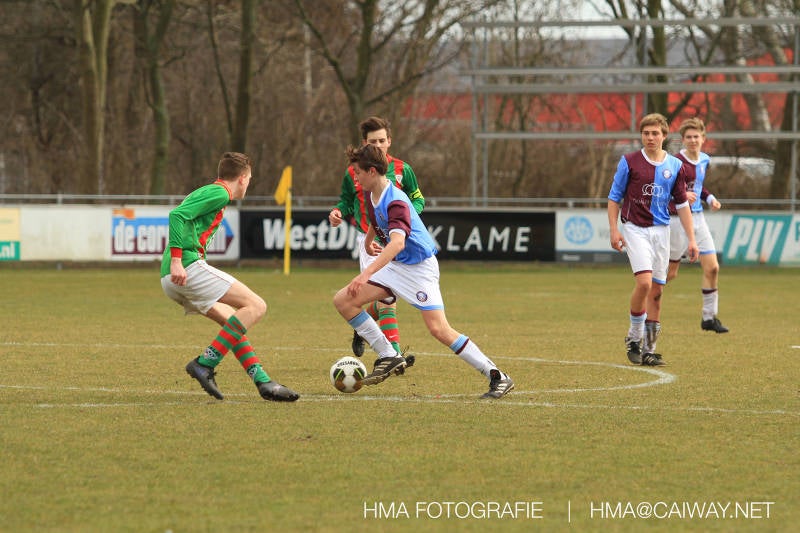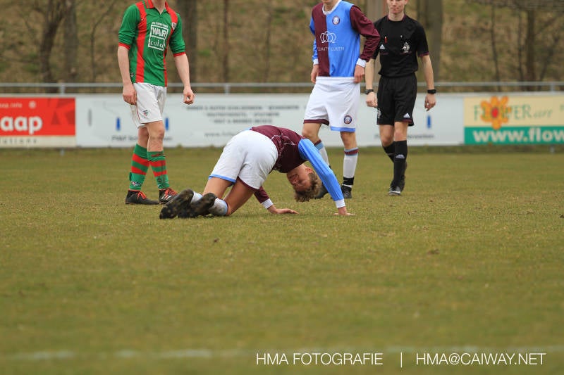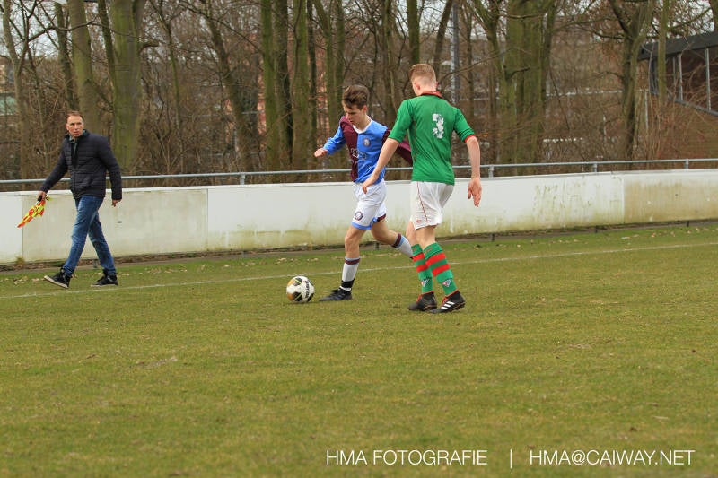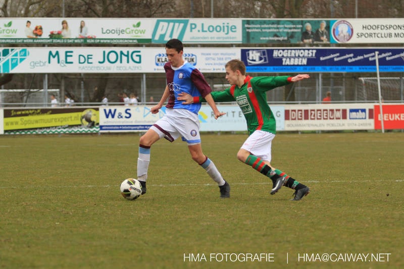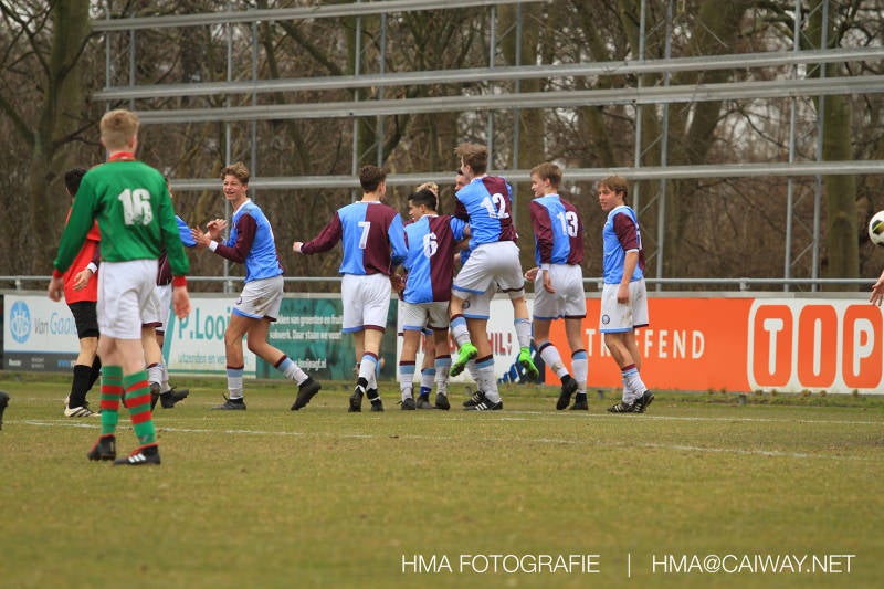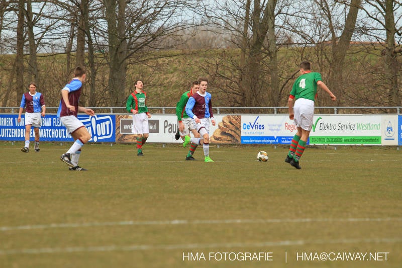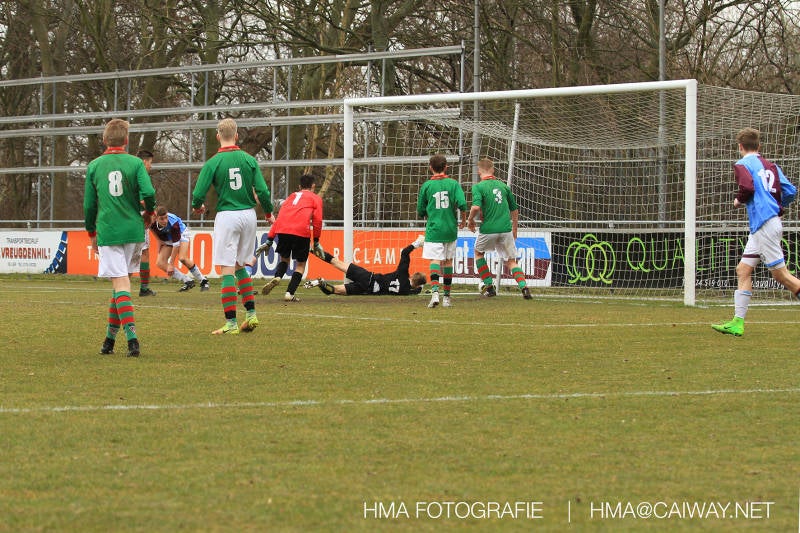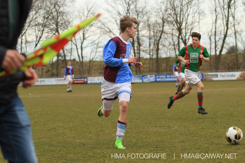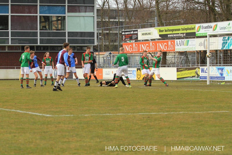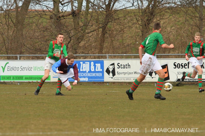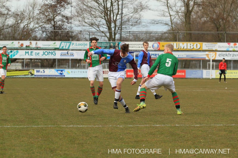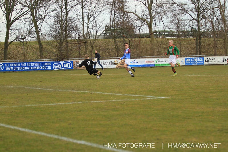De wedstrijd was begonnen en het was Velo dat met het 4-4-2 systeem razendsnel omschakelde na balverlies van Monster. Telkens weer stonden de middenvelders David Borgdorff,Ahmet Ayyildiz en Andreas Harinxma positioneel verkeerd opgesteld bij balbezit alsook zonder bal teveel naar voren waardoor bij balverlies de Velo spelers alle ruimte kregen voor het scheppen van kansen. De eerste minuut ontsnapte Monster nog maar in minuut 12 en 19 scoorde Velo 2 maal en dat was een logisch gevolg van het slechte positiespel van Monster. Meer coaching van achteruit is dan nodig om spelers op hun positie te wijzen. Dat Hidde v/d Arend in minuut 20 de aansluitingstreffer maakte en bijna ook de 2-2 op de schoen had(de keeper verkeek zich niet op zijn stiftje) was boeiend voor het schouwspel. De supporters zaten op het puntje van de stoel en het Velo publiek juichte bij de 1-3, Boy Hoevenaar speelde Duko Blans in die de bal niet onder controle kreeg en heel Monster stond toe te kijken hoe Velo de vrijgekomen bal razendsnel naar de spits kon spelen die simpel kon binnentikken.Bo Olstoorn spelend als linksachter moest veel ingrijpen bij dreigende situaties en Riley Eijkelenborg de rechtsachter bikkelde voortdurend om zijn ploeg te laten zien wat nodig was om Velo partij te geven. Uit een laag gegeven hoekschop van Thijs Looije kon Boy de bal van een meter of 9 in de rechterhoek schieten zodat de spanning net voor rust weer opliep 2-3. Scheidsrechter Thijs Hoekveen blies voor het begin van de tweede helft en op het middenveld van Monster waren 2 wissels gebracht. David maakte plaats voor Roy en Twan Lagrauw nam de plaats in van Andreas die niet helemaal fit was. Roy kreeg direkt een trap op de enkel , maar ging door en met mooie voetbalacties werd Velo naar achteren gedrongen. Uit een corner kopte Roy via het lichaam van een verdediger de 3-3 binnen. Dit doelpunt en de hoop dat het nu wel goed zou komen werd in 2 minuten de grond ingeboord. Eerst was het Dokan Berendse die een ongelukkige wedstrijd keepte en te weinig tijd voor zijn intrap nam en de bal pardoes voor een middenvelder van Velo trapte. Die bediende de spits en met een lob maakte hij de 3-4. Een minuut later word de in buitenspelstaande linksbuiten aangespeeld, hij neemt de bal echter niet aan en de overnemende linkermiddenvelder krult het leder om Dokan heen in de verre hoek 3-5. Na deze slappe momenten staat Monster op en probeert via alles of niets nog een punt te slepen uit deze wedstrijd. Stuart Schouw blijft alleen achter als laatste man en met de doorgeschoven Boy word meer grip op het middenveld verkregen. Kans op kans volgt waarbij vooral opvalt hoe het team werkt als een eenheid en je kan je afvragen waarom nu pas. De 4-5 word binnengeschoven door Hidde die pijlsnel achter de verdediging was doorgelopen. En werkelijk in de 80e minuut komt de bal voor en is het Duko die het ronde projectiel met een slimme hakbal vanaf bijna de achterlijn tegen de keeper aanschiet en de bal tergend langzaam over de doellijn loopt 5-5!!Wat een spektakel en ook een vreugde. Een meeslepend duel,slecht gespeeld toch nog een punt. Volgende week uit bij Die Haghe en dat het beter moet zal trainer Arjan in de trainingen van komende week wel overbrengen.