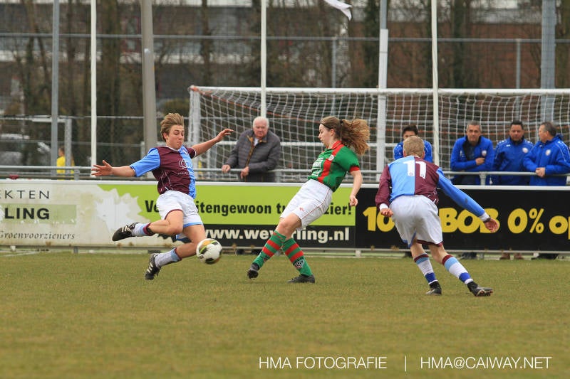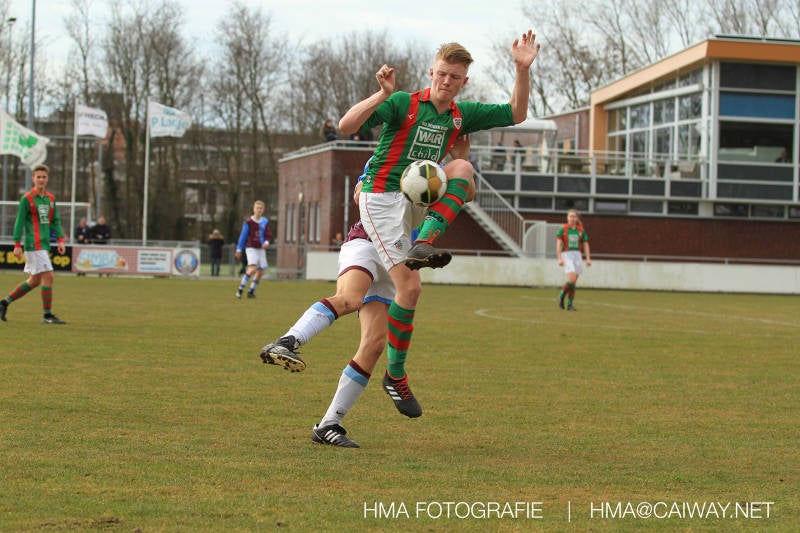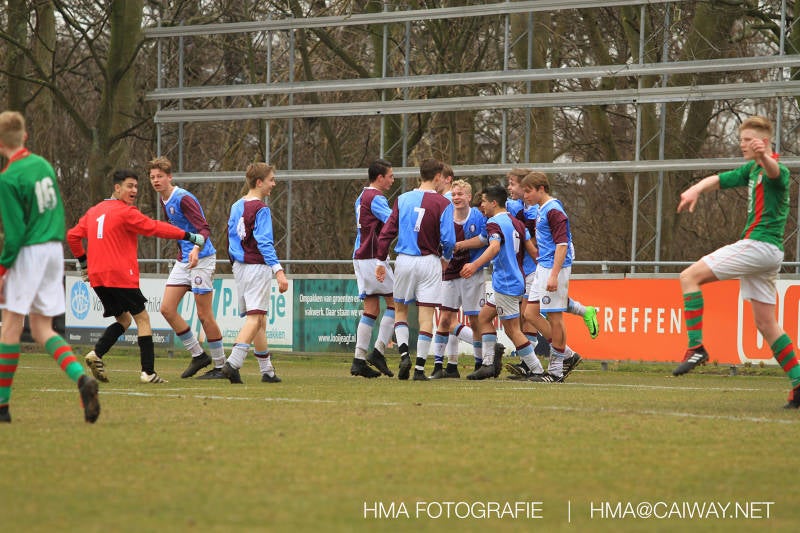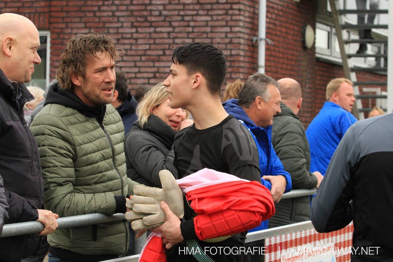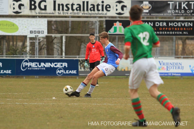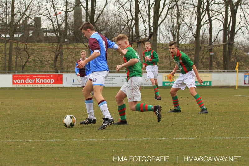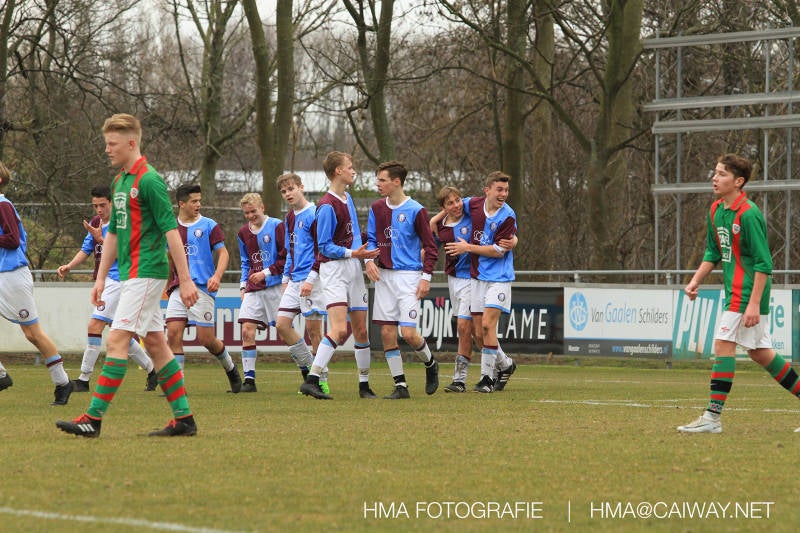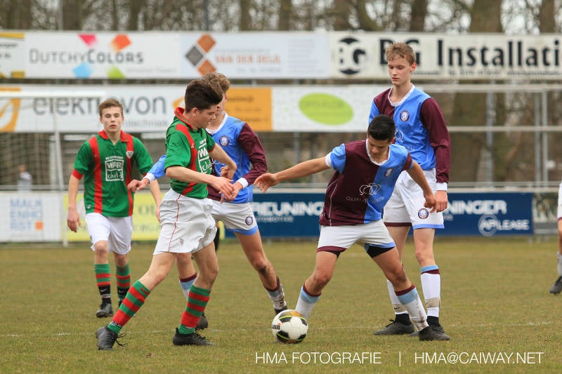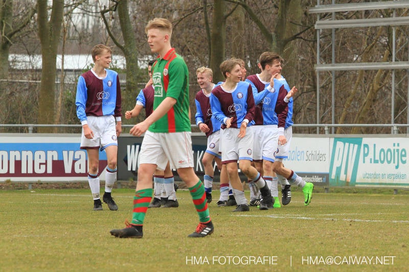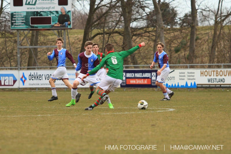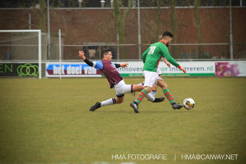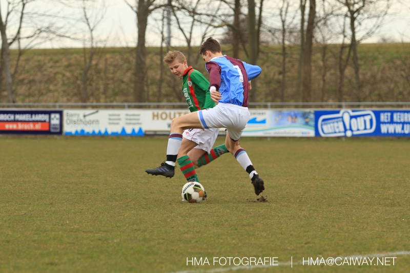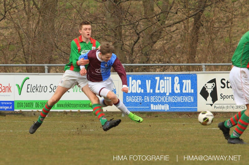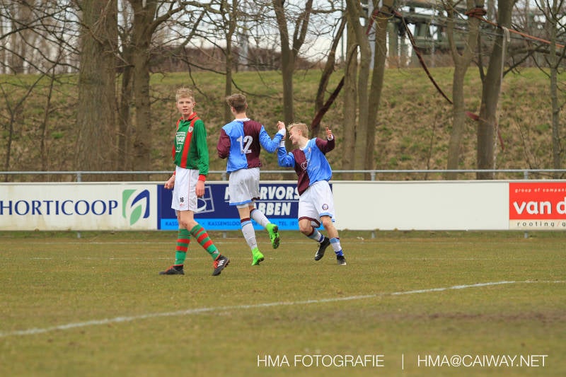 De wedstrijd was begonnen en het was Velo dat met het 4-4-2 systeem razendsnel omschakelde na balverlies van Monster. Telkens weer stonden de middenvelders David Borgdorff,Ahmet Ayyildiz en Andreas Harinxma positioneel verkeerd opgesteld bij balbezit alsook zonder bal teveel naar voren waardoor bij balverlies de Velo spelers alle ruimte kregen voor het scheppen van kansen. De eerste minuut ontsnapte Monster nog maar in minuut 12 en 19 scoorde Velo 2 maal en dat was een logisch gevolg van het slechte positiespel van Monster. Meer coaching van achteruit is dan nodig om spelers op hun positie te wijzen. Dat Hidde v/d Arend in minuut 20 de aansluitingstreffer maakte en bijna ook de 2-2 op de schoen had(de keeper verkeek zich niet op zijn stiftje) was boeiend voor het schouwspel. De supporters zaten op het puntje van de stoel en het Velo publiek juichte bij de 1-3, Boy Hoevenaar speelde Duko Blans in die de bal niet onder controle kreeg en heel Monster stond toe te kijken hoe Velo de vrijgekomen bal razendsnel naar de spits kon spelen die simpel kon binnentikken.Bo Olstoorn spelend als linksachter moest veel ingrijpen bij dreigende situaties en Riley Eijkelenborg de rechtsachter bikkelde voortdurend om zijn ploeg te laten zien wat nodig was om Velo partij te geven. Uit een laag gegeven hoekschop van Thijs Looije kon Boy de bal van een meter of 9 in de rechterhoek schieten zodat de spanning net voor rust weer opliep 2-3. Scheidsrechter Thijs Hoekveen blies voor het begin van de tweede helft en op het middenveld van Monster waren 2 wissels gebracht. David maakte plaats voor Roy en Twan Lagrauw nam de plaats in van Andreas die niet helemaal fit was. Roy kreeg direkt een trap op de enkel , maar ging door en met mooie voetbalacties werd Velo naar achteren gedrongen. Uit een corner kopte Roy via het lichaam van een verdediger de 3-3 binnen. Dit doelpunt en de hoop dat het nu wel goed zou komen werd in 2 minuten de grond ingeboord. Eerst was het Dokan Berendse die een ongelukkige wedstrijd keepte en te weinig tijd voor zijn intrap nam en de bal pardoes voor een middenvelder van Velo trapte. Die bediende de spits en met een lob maakte hij de 3-4. Een minuut later word de in buitenspelstaande linksbuiten aangespeeld, hij neemt de bal echter niet aan en de overnemende linkermiddenvelder krult het leder om Dokan heen in de verre hoek 3-5. Na deze slappe momenten staat Monster op en probeert via alles of niets nog een punt te slepen uit deze wedstrijd. Stuart Schouw blijft alleen achter als laatste man en met de doorgeschoven Boy word meer grip op het middenveld verkregen. Kans op kans volgt waarbij vooral opvalt hoe het team werkt als een eenheid en je kan je afvragen waarom nu pas. De 4-5 word binnengeschoven door Hidde die pijlsnel achter de verdediging was doorgelopen. En werkelijk in de 80e minuut komt de bal voor en is het Duko die het ronde projectiel met een slimme hakbal vanaf bijna de achterlijn tegen de keeper aanschiet en de bal tergend langzaam over de doellijn loopt 5-5!!Wat een spektakel en ook een vreugde. Een meeslepend duel,slecht gespeeld toch nog een punt. Volgende week uit bij Die Haghe en dat het beter moet zal trainer Arjan in de trainingen van komende week wel overbrengen.