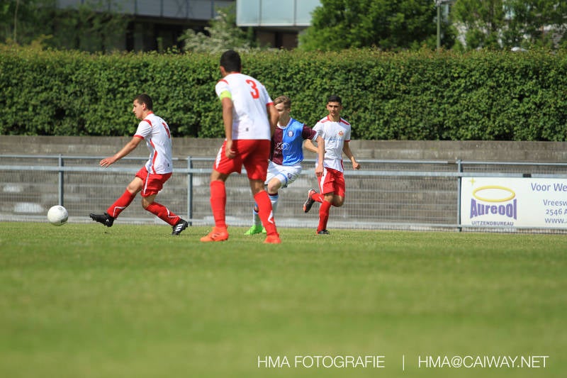 Het spel golfde op en neer. Hidde werd diep gestuurd, kwam voor de keeper maar schoot naast. Scherpte ontbrak in de beginfase en door een zwak schot van een VCS speler kwam de bal via de kluts voor de voeten van hun spits en die maakte randje buitenspel de 1-0. Sportclub Monster was direkt wakker en een paar mooie aanvallen volgden op het VCS doel. De 1-1 werd na een assist van Hidde binnengeschoten door Duko. Thijs maakte een prima aktie, maar zijn voorzet werd slecht ingeschoten. Zo waren er prima kansen, een stuk of 5 maar geen doelpunten. De rust brak aan, en de vraag was zouden Guus, Ahmet en Boris het vele loopwerk op het middenveld vol kunnen blijven houden? Als na rust de ploegen weer op het veld staan is de zon nog iets scherper gaan schijnen. Sportclub Monster lijkt de betere conditie te hebben, de ruimtes worden groter en via passes van de goed acterende achterhoede Bo,Stuart,Boy en Riley worden Hidde en Thijs veelvuldig gezocht.